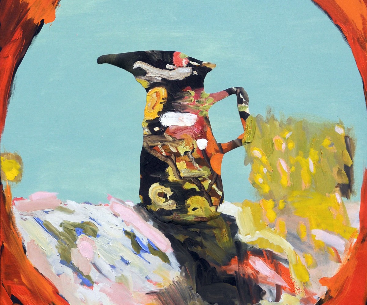 “The Wattle Room is my diary, with the written words expressed as exhibition chapters. I collage my feelings, dislocated fragments trying to reconcile appearing comic. I step off my great love of 20th-century poetry and literature with a fascination for the absurd, which is the foundation of my paintings. I express in optimistic bright colours and exaggerate the repetitive motifs to create a humorous Vanitas concept, making up my own symbols as reminders of how to live my life.”