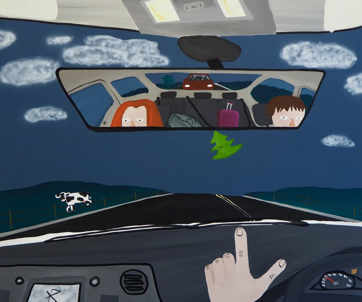 My paintings are characterised by distorted proportions, bold colour choices and playful stylistic elements like stacked space, exaggerated eyes, and naive hands. Pockets of time are punctuated with long limbs and looming vistas to consider the notion of shared memory. These visual markers give each piece a unique character while maintaining a recognisable quality, inviting viewers to find familiar experiences across my work.’