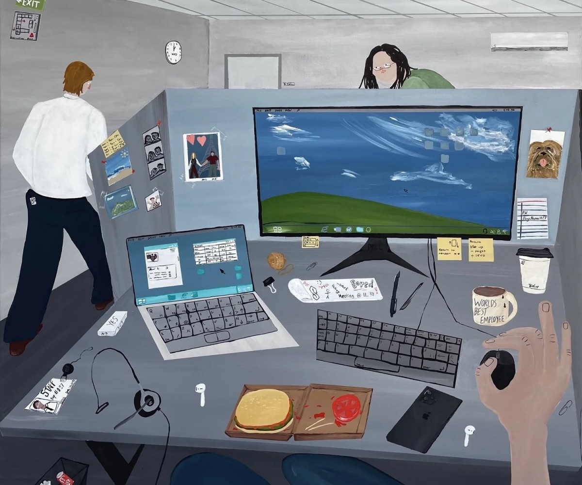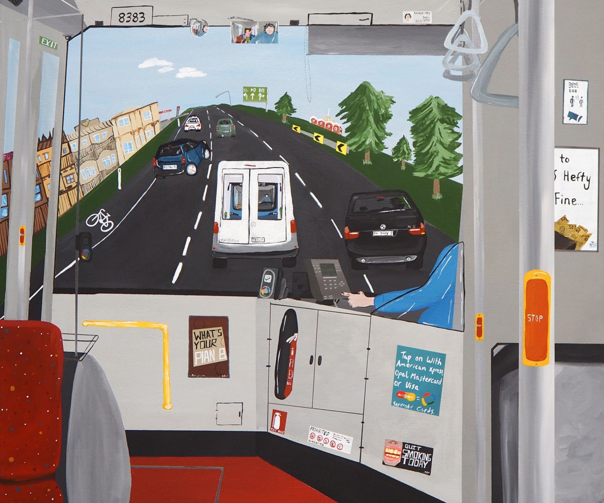 ‘Through faux-naive figurative paintings, I explore the shared everyday experiences that connect us. My work investigates the quiet, routine moments many of us live through; mundane routines, sharing meals, taking out the bins. My work seeks to transform representations of these everyday moments into opportunities for meditation on contemporary life and shared experience through connection and conversation.