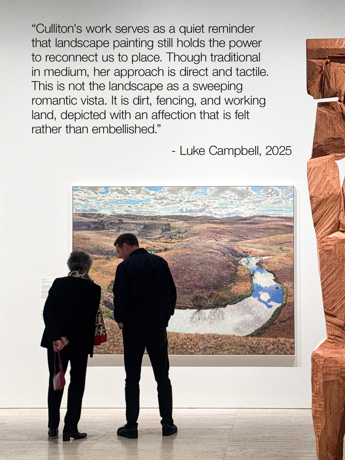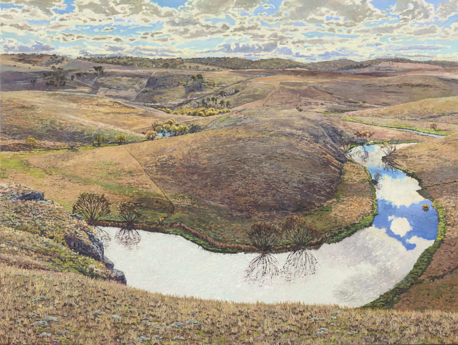 A nine-time Wynne Prize finalist, Culliton takes an expansive view of the undulating landscape but also dwells in detail on blades of grass and dimpled clouds. Based on a smaller study painted en plein air (outdoors), the full-scale painting is electrified by blue sky, reflected on the surface of Cambalong Creek. – Lucy Culliton’s Artist Statement, 2025
