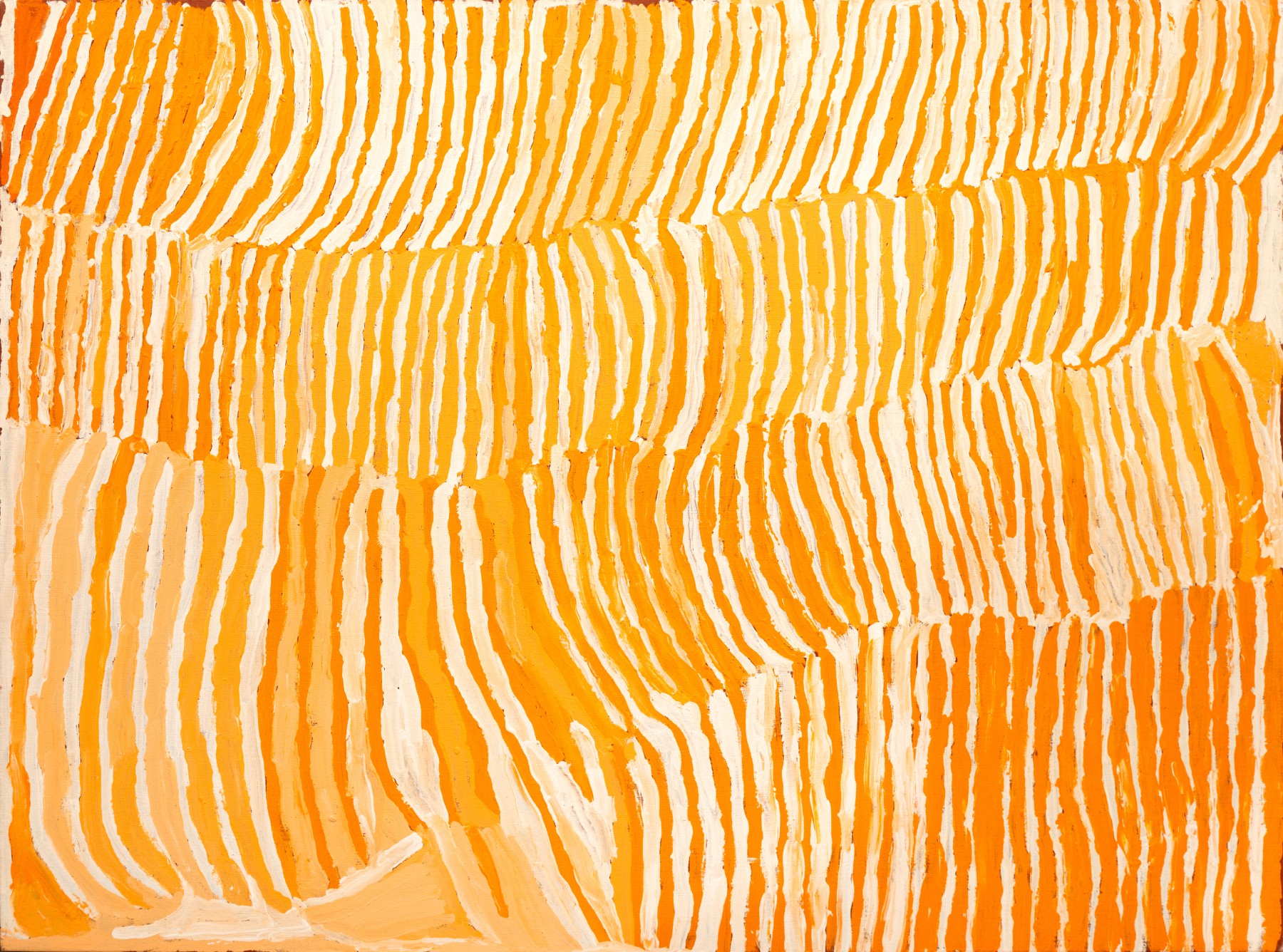 Makinti’s paintings often feature ceremonial hairstring belts, “shown as sets of lines varying in hue and density, usually in bold yellows and oranges, alternating with white. Her bands of lines form into sweeping arcs, creating patterns that twist and bend, blown by an invisible wind in many directions across the surface.” (Alec O’Halloran, 2000).