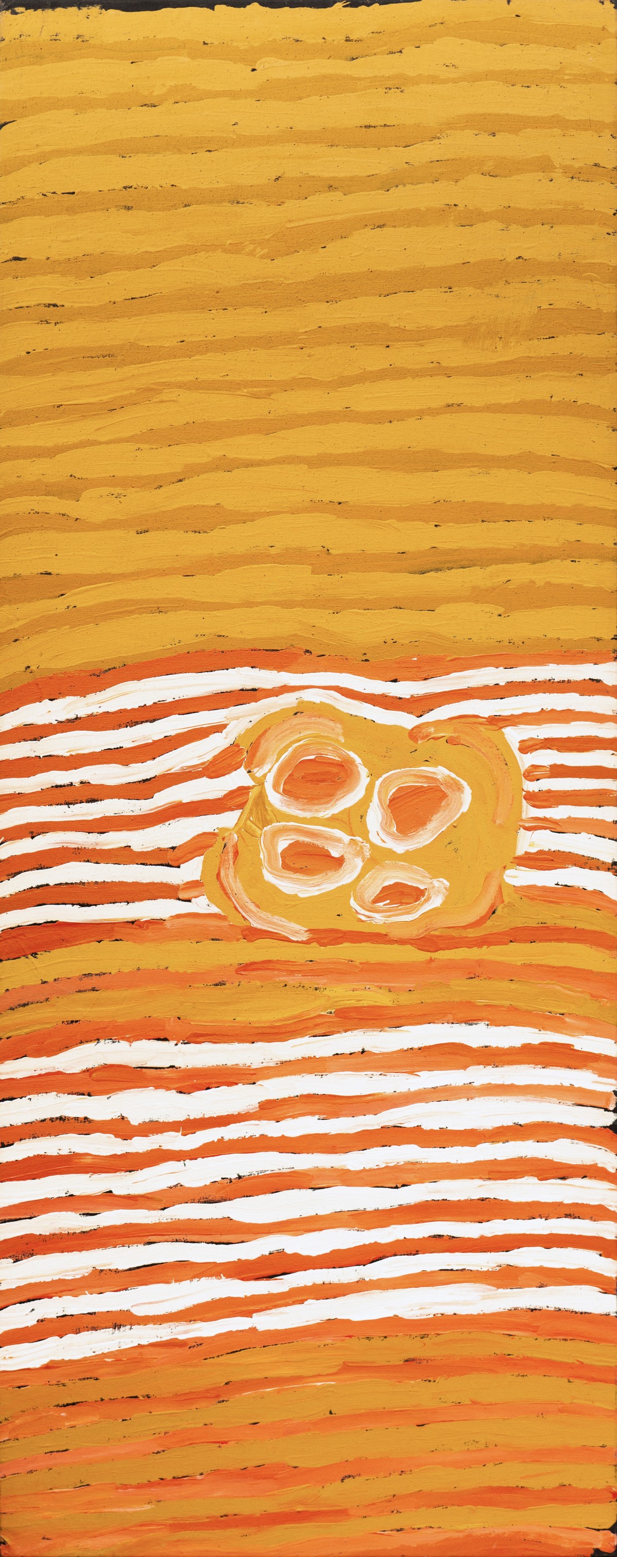 Makinti’s paintings often feature ceremonial hairstring belts, “shown as sets of lines varying in hue and density, usually in bold yellows and oranges, alternating with white. Her bands of lines form into sweeping arcs, creating patterns that twist and bend, blown by an invisible wind in many directions across the surface.” (Alec O’Halloran, 2000).